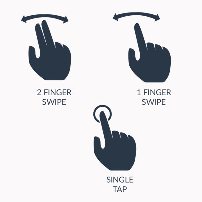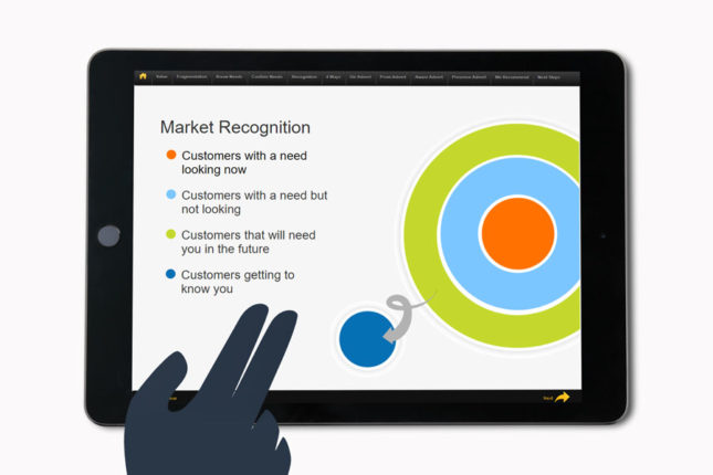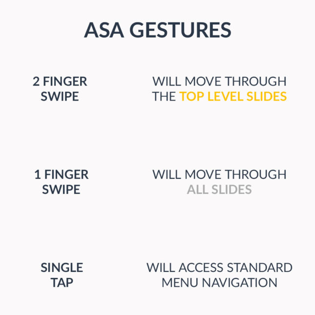 Although we have a menu built into the app, we also incorporated a system that uses a few gestures to help the salesman navigate through his presentation. Swiping with 2 fingers to the left or right will allow him to skip back and forth to the top level categories. Swiping with 1 finger will allow him to go forward or backward to the next page.